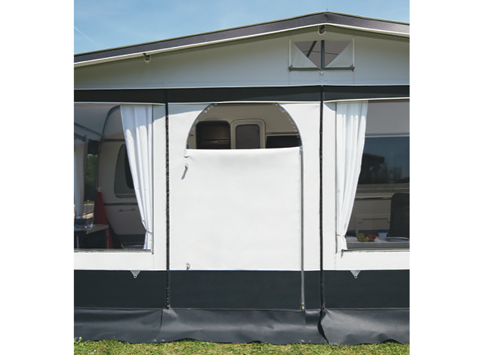 Sprednja stena je deljiva in odstranljiva, vhodna vrata se zvijejo in postavljena levo od sredine, okna pa so opremljena z zavesami. Obe stranski steni sta odstranljivi, ena ima stransko zvijalna vrata, obe pa velika prezračevalna okna s folijskimi loputami, ki jih je mogoče zapreti z zadrgo. Pod okni so vodoravni tuneli za pritrditev dodatnega ogrodja ali verandnih palic, kar omogoča še večjo stabilnost.