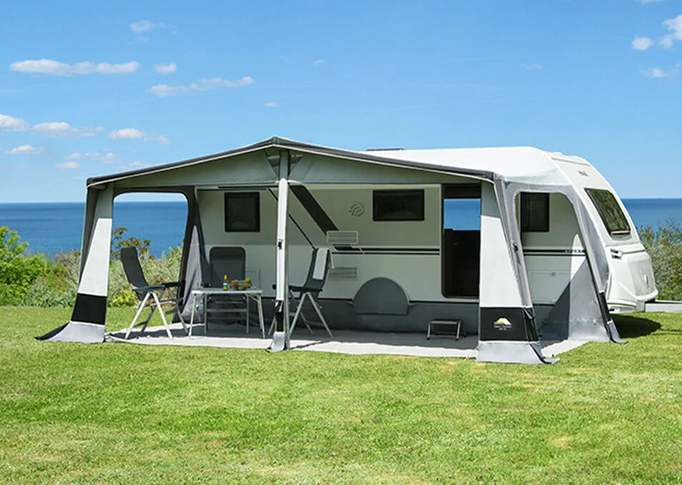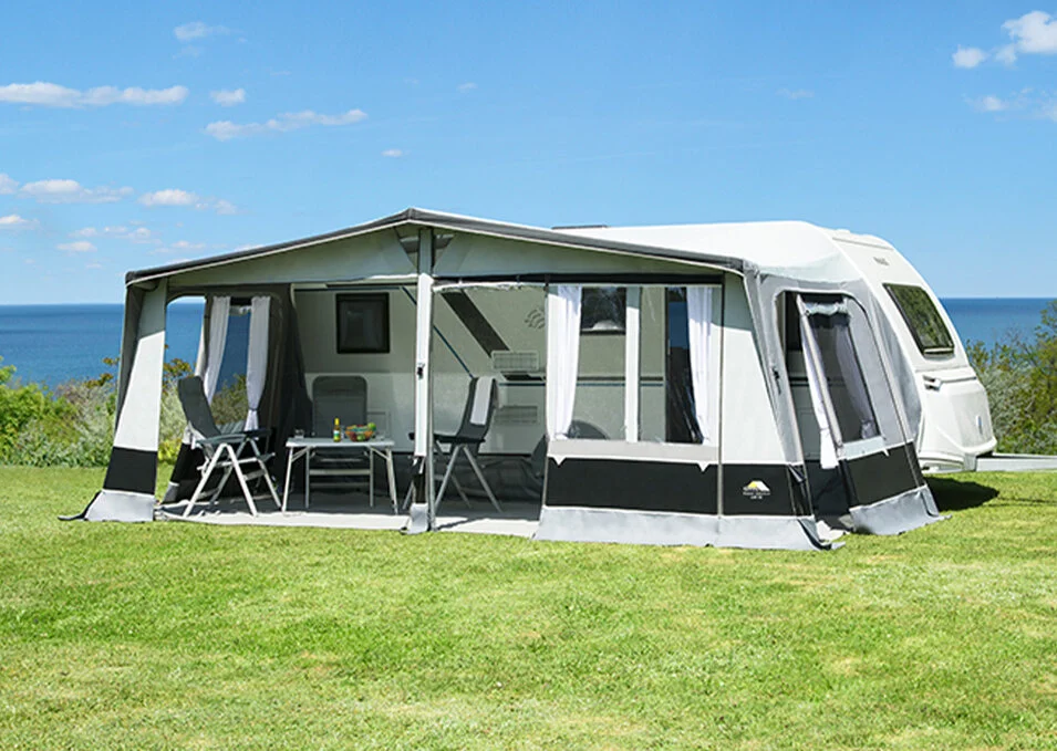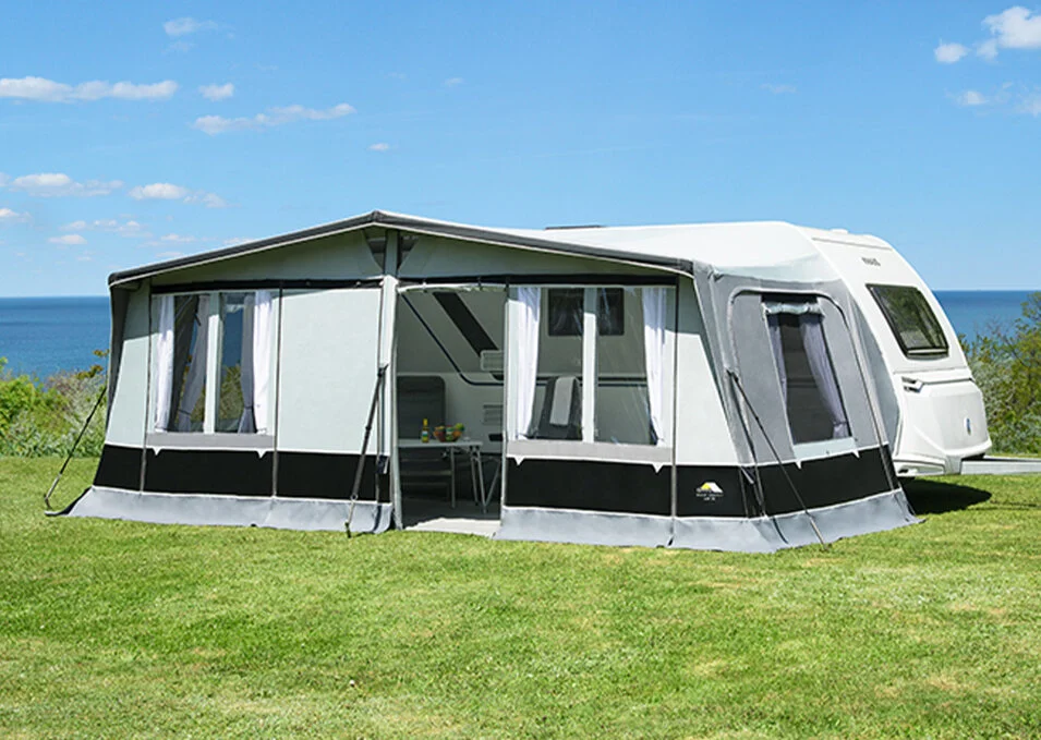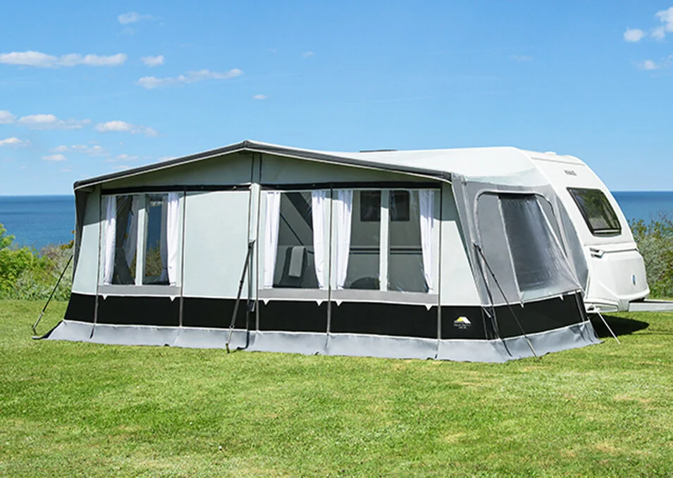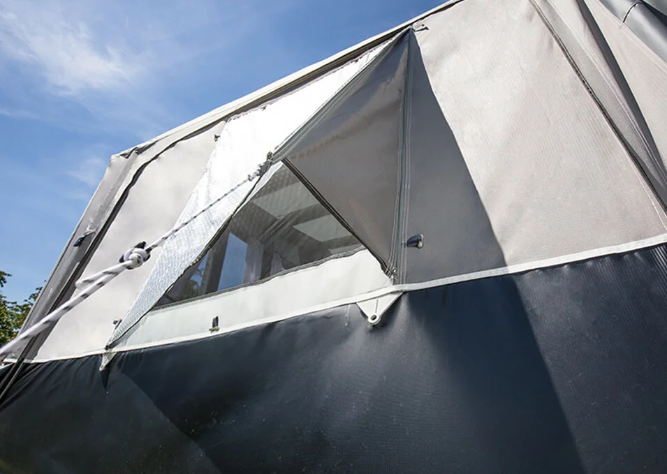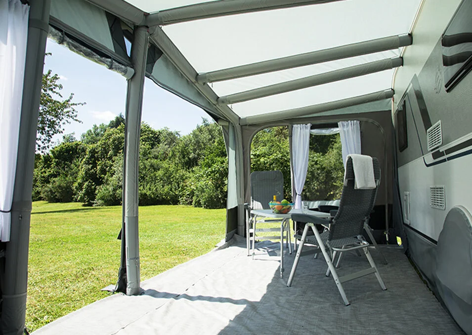 Obe stranski steni sta odstranljivi, vsaka ima stranska vrata katera se lahko zvijejo in velika prezračevalna okna iz mreže s folijskimi loputami, ki jih je mogoče odpreti kot zaščiteno prezračevanje tudi med dežjem. Konstrukcija temelji na Air-In sistemu z zračnimi cevmi premera 10 cm, dodatnimi cevmi v strehi in sprednji steni ter nastavitvenimi bloki za prilagajanje neenakomernim površinam. Šotor je mogoče pritrditi notranje ali zunanje, ima zaščito pred vetrom in možnost dodatne stabilizacije pod okni. Travel Comfort Air je idealen za vse, ki želijo prostoren, zračen in trpežen predšotor za udobno potovalno kampiranje